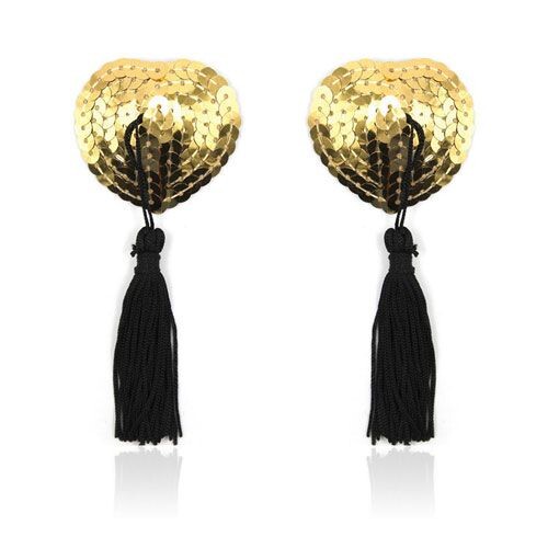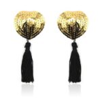 Copricapezzoli a forma di cuore con strass dorati e nastrini neri. Un prodotto della linea Fetish ..