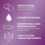 Il lubrificante Durex Aloe Vera è 2 prodotti in 1: un gel corpo per momenti di particolare sensualità e divertimento, e un lubrificante intimo a base d’acqua che aumenta il piacere durante i rapporti. La sua formula è arricchita con Aloe Vera, ancora più delicata e ricca di elementi nutritivi che svolge un’azione rigenerante e dona morbidezza alla pelle. Perfetto come lubrificante per rapporti anali, orali e vaginali. Inoltre non unge, non macchia ed è facile da lavare via. Delicato ed adatto per alleviare la secchezza vaginale, può essere utilizzato con sex toys e preservativi in lattice e poli-isoprene. Pratico formato da 200 ml con tappo anti goccia. Non è un contraccettivo e non contiene spermicida. Utilizzare entro 3 mesi dall’apertura.
