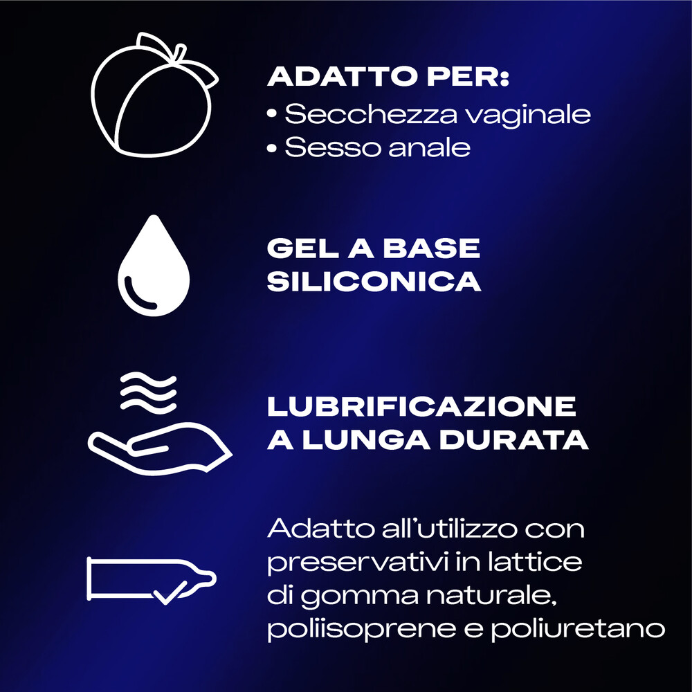 Il lubrificante Durex Eternal Connection è un gel intimo a base siliconica che, a differenza dei coadiuvanti ad acqua, rende i rapporti intimi più fluidi e piacevoli. Setoso e tiepido al tatto, questo gel ha una speciale formula che offre una lubrificazione di lunga durata ed è adatto per i rapporti anali, vaginali o orali. Compatibile con l’uso di sex toys e preservativi in lattice, poliuretano e poliisoprene. Tenere il prodotto fuori dalla portata dei bambini e conservarlo in un luogo fresco ed asciutto. Si consiglia di non applicare il prodotto sulla pelle irritata o lesa e di sciacquare abbondantemente con acqua in caso di irritazione o contatto con gli occhi. Non è un contraccettivo e non contiene spermicida. Utilizzare entro 3 mesi dall’apertura.