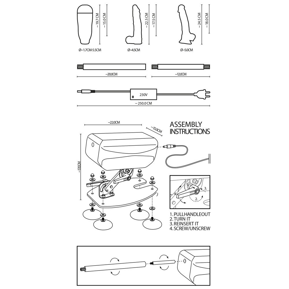 - Macchina del sesso (22 cm x 15 cm x 17 cm), asta lunga 12 cm, asta di prolunga lunga 20 cm.