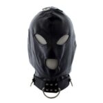 Maschera in stile bondage, con lacci di chiusura, fori per occhi e bocca e collare costrittivo. Fa ..