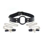 Morso in metallo (ricoperto di stoffa) con annessi ganci per capezzoli.