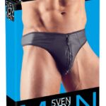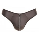 Perizoma in tessuto nero lucido con zip frontale ornato da lucenti strass, che dona un sexy effetto fetish, impreziosito da profili con luccicanti strass, e una comoda e pratica cercniera zip anteriore per essere subito pronti all’azione. Uno slip molto sexy e rock, in fascinoso tessuto traslucido, elegante e dall’impatto fetish, per l’uomo che non deve chiedere mai.