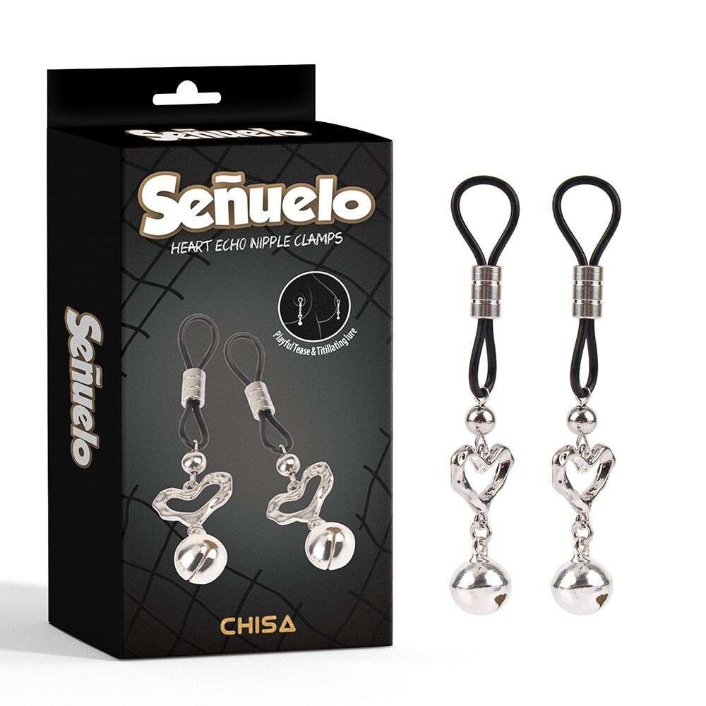 Le pinze per capezzoli Chisa Heart Echo sono dei graziosi strizza capezzoli con delle piccole decorazioni a forma di cuore con campanellini, che oscilleranno e suoneranno sensualmente a ogni tuo movimento e lasceranno il tuo partner senza fiato.