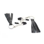 Coppia di pinze per capezzoli della linea Fetish Art di Toyz4Lovers. I morsetti sono facilmente regolabili grazie alla vite apposita ed agli stessi sono collegati dei nastrini, per un look stravagante oltre che trasgressivo.