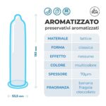 I preservativi Aromatizzati Love Match sono i profilattici aromatizzati che faranno scoprire il gusto di fare l’amore. Sono degli ottimi alleati del sesso orale: scopri ogni volta un sapore diverso, prova gli aromi afrodisiaci di cioccolato, fragola e banana e riaccendi la fantasia grazie alla straordinaria stimolazione di colori e fragranze nuove! I preservativi, se utilizzati correttamente, tutelano la donna da gravidanze indesiderate e proteggono entrambi i partner da malattie sessualmente trasmissibili. Sono realizzati in lattice di gomma naturale, hanno una larghezza nominale di 53,5 mm e sono dotati di un’apertura no-stress.