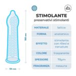 I preservativi Stimolanti Love Match sono profilattici dalla forma “easy-on” con serbatoio che, grazie alla superficie ricca di rilievi e venature, regalano un’extra stimolazione per entrambi i partner, amplificando le sensazioni di piacere durante il rapporto. Inoltre ti garantiscono un’ottima vestibilità, massimo comfort e piaceri amplificati. Sono realizzati in lattice di gomma naturale. Hanno una larghezza nominale di 54 mm. Dotati di un’apertura no-stress. É necessario lavarsi sempre accuratamente le mani prima di scartare il condom. Fai attenzione a non lacerarne la superficie durante l’inserimento. Conservare in luogo fresco e asciutto, lontano dalla luce diretta del sole.