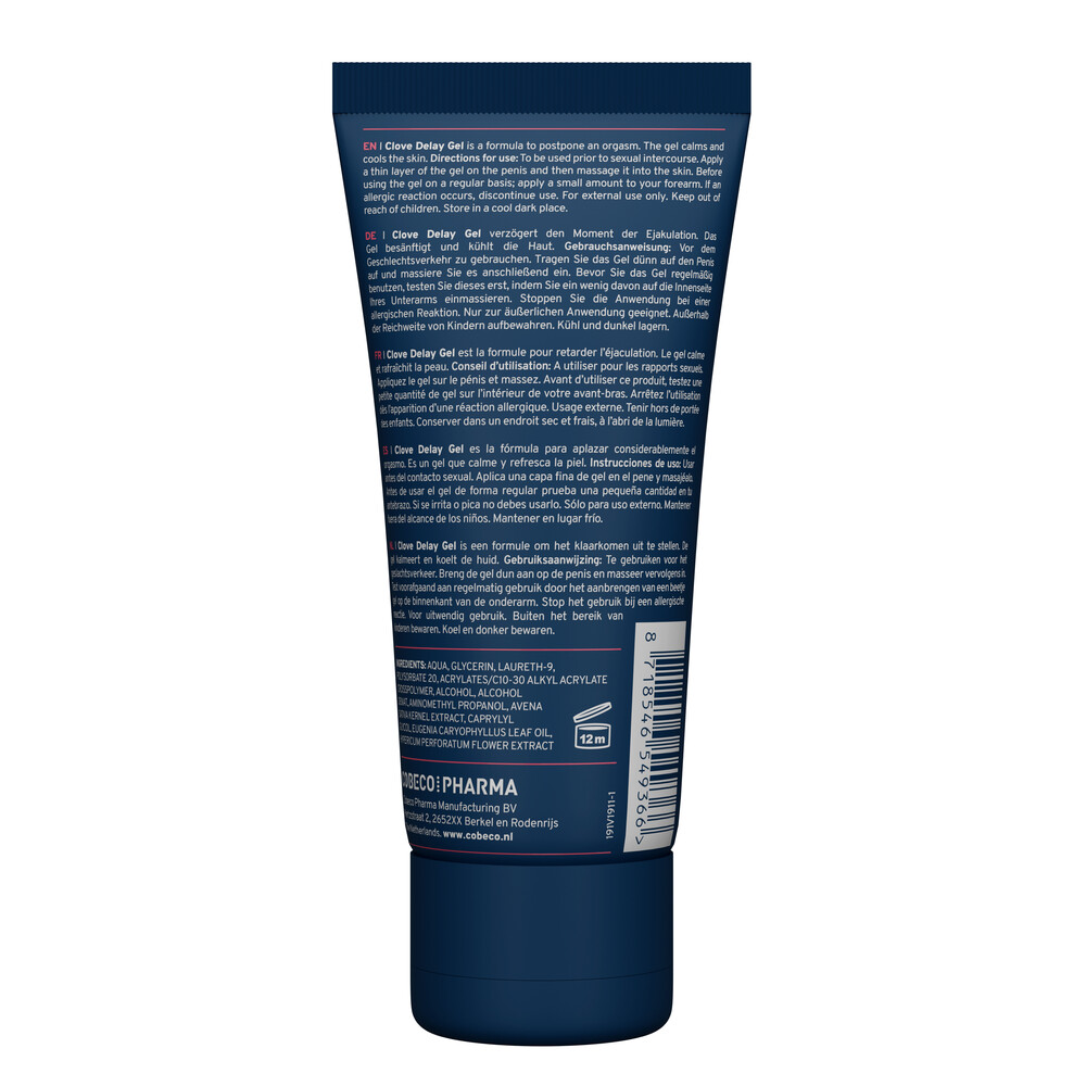 Il ritardante uomo Clove è un gel studiato per contrastare i disturbi relativi all’eiaculazione precoce, rendendo le performance sessuali più lunghe e più intense. Creato con ingredienti di qualità tra cui olio di chiodi di garofano, Clove renderà i momenti intimi più appaganti per entrambi i partner. La sua azione anestetizzante agisce sulle parti più sensibili del pene aiutando a mantenere l’erezione più a lungo. Inodore, dermatologicamente testato. Ha un effetto rinfrescante ed è compatibile con l’uso di profilattici. Tenere il prodotto fuori dalla portata dei bambini e conservarlo in un luogo fresco ed asciutto. Si consiglia di non applicare il prodotto sulla pelle irritata o lesa e di sciacquare abbondantemente con acqua in caso di irritazione o contatto con gli occhi. Non ingerire. Non utilizzare se la partner sessuale è in stato interessante. Solo per uso esterno. Modo d’uso: Applicarne una discreta quantità sul pene mezz’ora prima del rapporto. Quantità e tempi dipendono da esigenze individuali. Lavare delicatamente prima del rapporto.
